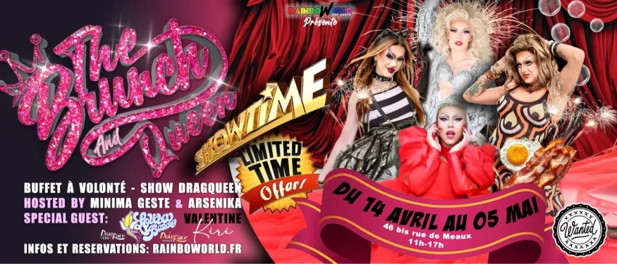 Le Brunch and Queen , le brunch le plus tucké de la capitale vous donne rendez-vous tous les dimanches au Wanted ! hosté par la sublime Minima Geste vous y retrouverez les Queens les plus démentes de la capitale et d'ailleurs tel que Arsenika, Lolita Banana, Ginger Bitch, Misty Phoenix..... qui se relaieront pour vous faire vivre un moment unique autour de notre buffet Italien XXL et à volonté comprenant un large choix de plats et desserts qui sauront vous séduire ainsi qu'un buffet de boissons chaude et froide également à volonté.