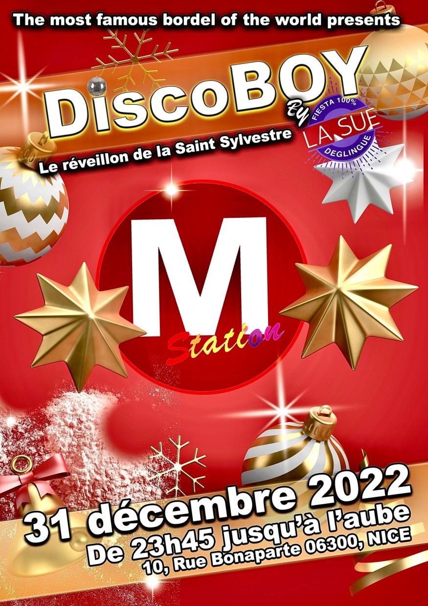 Ce 31 décembre , c'est double ration de paillettes, de boule à facettes et cotillons avec en plus la musique déjantée mixée par LaSue, bref, c'est LA FÊTE, et c’est l'ambiance DiscøboY !!! et tout ça arrosé au champagne (ou à la bière, au poppers ou à ce que vous voulez!!)