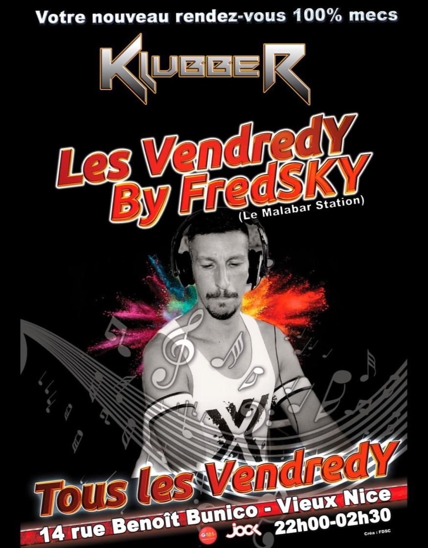 Vendredi soir dès 22h00 jusqu’à 02h30 ce sera la VENDREDY By FredSKY. La seule soirée 100% mecs pour nous les mecs !!! Désolé les filles !