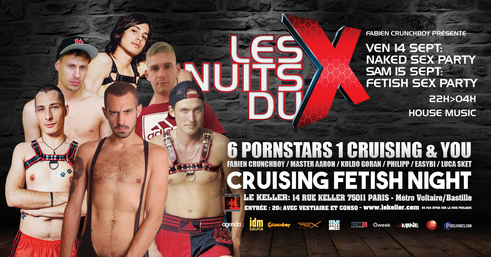 Pour ceux qui ont envie de passer une soirées plutôt HOT, notre ami Fabien Crunchboy sera accompagné de nombreuses Pornstars pour une 7eme édition au KELLER en vous proposant un WEEK-END DE LA NUIT DU X ! vendredi ce sera NAKED SEX PARTY (a poil ou en jockstrap ok) et samedi FETISH SEX PARTY (tout trip fetish, latex, sportswear, cuir, ect...) C'est pendant 2 nuits très chaudes que vous aurez la chance de venir côtoyer des Pornstars venues de toute l'Europe ! 14 rue Keller - 75011 Paris